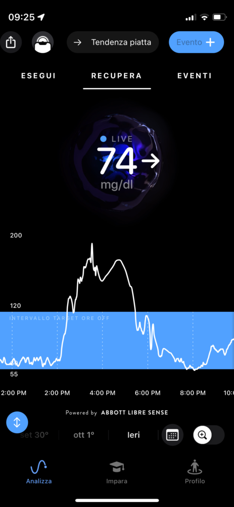 NB: la notte non avevo, dormito, al mattino mangiato pochino per cui era il mio primo vero pasto, non ho mangiato verdure, 1 h dopo stavo correndo per prendere il treno = curva con picchi su e giù